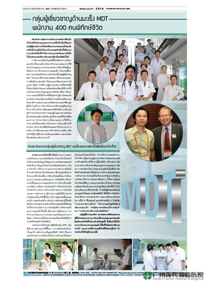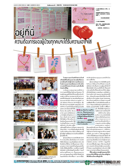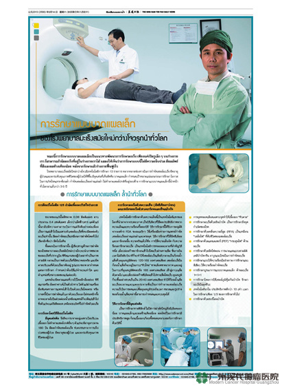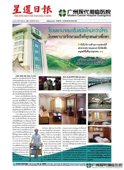 ในวันที่ 14 กันยายน พ.ศ. 2556 หนังสือพิมพ์ไทย “ซิงเสียนเยอะเป้า” ได้ลงบทความเกี่ยวกับโรงพยาบาลมะเร็งสมัยใหม่กว่างโจว 4 บท ซึ่งในบทความได้แนะนำโรงพยาบาล เทคโนโลยีการรักษามะเร็งที่ทันสมัย ทีมแพทย์ผู้เชี่ยวชาญที่มีชื่อและการรักษามะเร็งของผู้ป่วยไทยในโรงพยาบาลแห่งนี้ เล่าถึงรายละเอียดจากหลายๆ มุมมองของโรงพยาบาลมะเร็งสมัยใหม่กว่างโจว ดึงดูดผู้คนให้หันมาให้ความสนใจต่อเทคโนโลยีใหม่ในการรักษามะเร็งของโรงพยาบาลมะเร็งสมัยใหม่และยังถูกพูดถึงในวงกว้างอีกด้วย