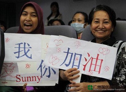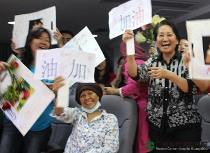 เนื่องจากได้รับความรู้สึกบรรยากาศคึกคักตรงจากงานแข่งขันครั้งนี้ ผู้ป่วยจากต่างประเทศก็เข้าร่วมขบวนการร้องเพลง คุณfan ผู้ป่วยจากฮานอยประเทศเวียดนามได้รับเสี่ยงปรบมือคึกคักโดยร้องเพลงภาษาเวียดนาม“เจ้าพ่อเซี่ยงไฮ้” หลังจากนี้คุณเฉินญาติผู้ป่วยจากประเทศอินโดนีเซียร้องเพลงจีน“พระจันทร์แทนใจฉัน”ให้ประทับใจท่านผู้ชมมาก Miss huangท่านผูป่วยจากประเทศอินโดนีเซียเกิดอารมณ์ขึ้น ได้ขึ้นเวทีไปร้องเพลงพร้อมกับคุณเฉิน หลังจากร้องเพลงเสร็จคุณเฉินกล่าวว่า ขอให้เพื่อนๆจากอินโดนีเซียเชื่อใจ โรงพยาบาลมะเร็งสมัยใหม่กว่างโจว ที่นี่สามารถมอบสุขภาพที่ดีแก่พวกคุณ เราต้องร่วมแรงร่วมใจสู้กับโรคร้าย นี่ก็เป็นความหวังของผ็ป่วย ก็เป็ยแรงผลักตันเราต้องก้าวหน้าเพื่อสุขภาพผู้ป่วย โรงพยาบาลมะเร็งสมัยใหม่กว่างโจวยืนข้างกับท่านเอาชนะโรคมะเร็ง