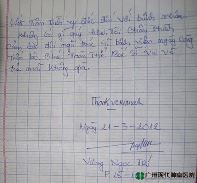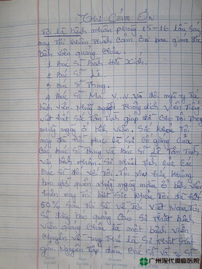 ฉันเป็นผู้ป่วยเตียงที่ 15-16 ที่อยู่ชั้นหก ต้องขอบคุณจากใจจริงต่อโรงพยาบาลมะเร็งสมัยใหม่กว่างโจว รวมทั้งเจ้าหน้าที่พยาบาลทุกๆ ท่านและผู้อำนวยการเผิง ผู้อำนวยการหลี่ คุณหมอจง คุณหมอเหมย รวมถึงล่ามที่คอยช่วยฉันแปลภาษาอยู่ตลอดเวลา ร่างกายของฉันตอนนี้ฟื้นฟูดีขึ้นมากแล้วเนื่องจากได้รับการรักษาและการดูแลเอาใจใส่เป็นอย่างดีจากคุณหมอ ความทรงจำตลอดระยะเวลาที่ฉันพักรักษาตัวอยู่ที่โรงพยาบาลจะไม่มีวันจางหายไป ตอนนี้อาการของฉันดีขึ้นกว่า 50 เปอร์เซ็นต์แล้ว หลังจากที่ฉันกลับประเทศเวียดนาม ฉันจะลงหนังสือพิมพ์และโฆษณาโรงพยาบาล ว่าเป็นที่ที่มีความเชี่ยวชาญชำนาญในการรักษาโรคมะเร็ง มีเจ้าหน้าที่พยาบาลที่มีความขยันขันแข็งเป็นอย่างมาก และมีคุณธรรมจริยธรรมที่ดีต่อผู้ป่วยอีกด้วย