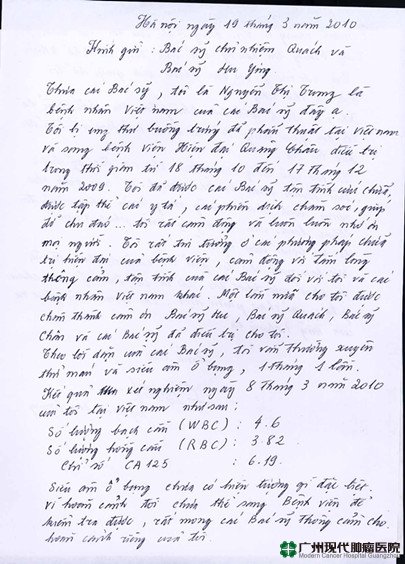 ดิฉันชื่อหย่วนซื่อจงเป็นผู้ป่วยมะเร็งรังไข่และเคยทำการผ่าตัดที่เวียดนาม ดิฉันมารักษาตัวที่โรงพยาบาลมะเร็งสมัยใหม่กว่างโจวในช่วงวันที่18 ตุลาคม 2009 ถึง 17ธันวาคม 2009 ขอบคุณทั้งหมอและพยาบาล รวมถึงล่ามที่ให้ความช่วยเหลือและให้การดูแลเอาใจใส่ คุณหมอและนางพยาบาลมีความอดทนและมีน้ำใจต่อคนไข้ทุกราย ดิฉันรู้สึกซาบซึ้ง ขอบคุณทุกท่านด้วยความจริงใจ