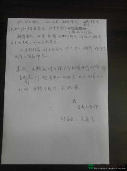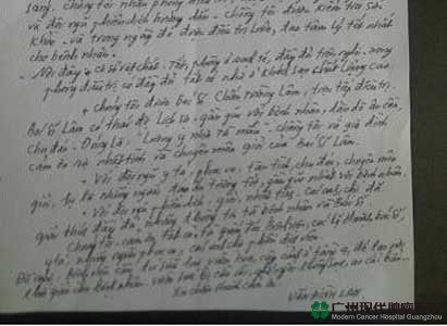 ปัจจุบัน โรคของคุณเหวินได้ดีขึ้นแล้ว เขาชื่อชมว่า โรงพยาบาลมะเร็งสมัยใหม่กว่างโจวเป็นแหล่งวิเศษที่ทำให้ชีวิตเกิดใหม่ ก่อนมาคุณเหวินกับภรรยายังมีข้อสงสัยในใจ แต่ก่อนเดินทางกลับเวียดนามเขาสองคนได้เขียนจดหมายขอบคุณถึงโรงพยาบาลมะเร็งสมัยใหม่กว่างโจว ซึ่งแสดงให้เห็นถึงความเคารพต่อชีวิตและความเมตตาต่อผู้ป่วยของทีมพยาบาลของโรงพยาบาลมะเร็งสมัยใหม่กว่างโจว
